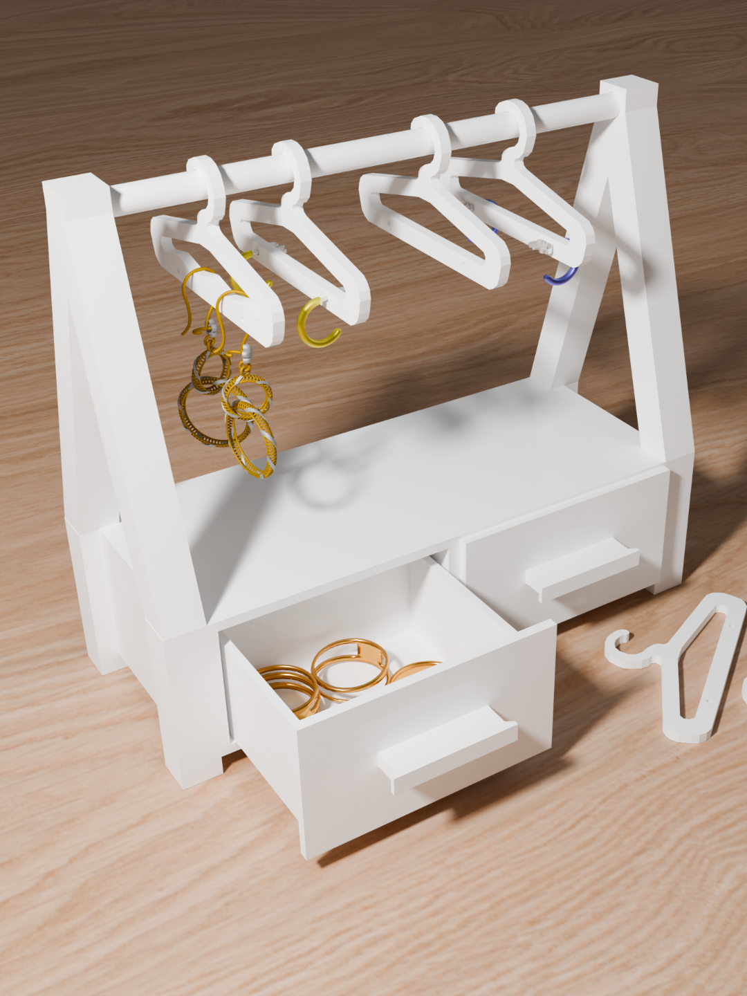 El joyero consta de dos cajones, encima de los cuales hay una repisa y una percha para ropa Puede agregar alrededor de 10 perchas o seis perchas y dos relojes Existen dos tipos de perchas diferentes Elija las que prefiera