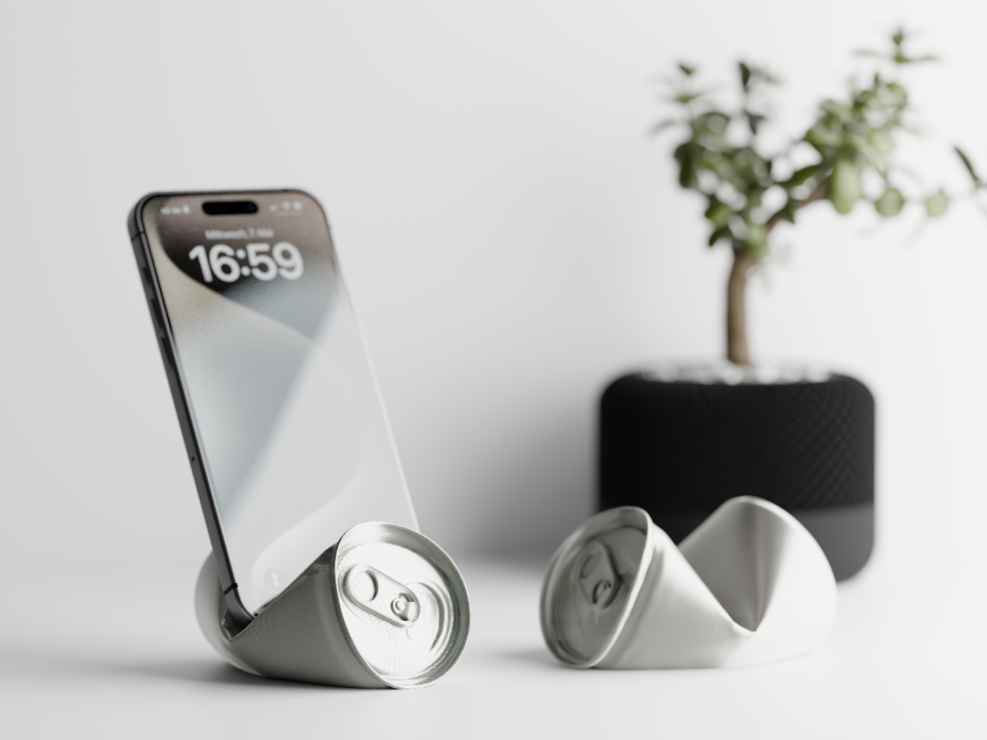 Salude al Soporte para teléfono con forma de lata de refresco – el soporte que es tan audaz como práctico. Diseñado para parecerse a una lata de refresco aplastada, esta pieza impresa en 3D combina un diseño divertido con una función cotidiana, sujetando su teléfono con un estilo serio.